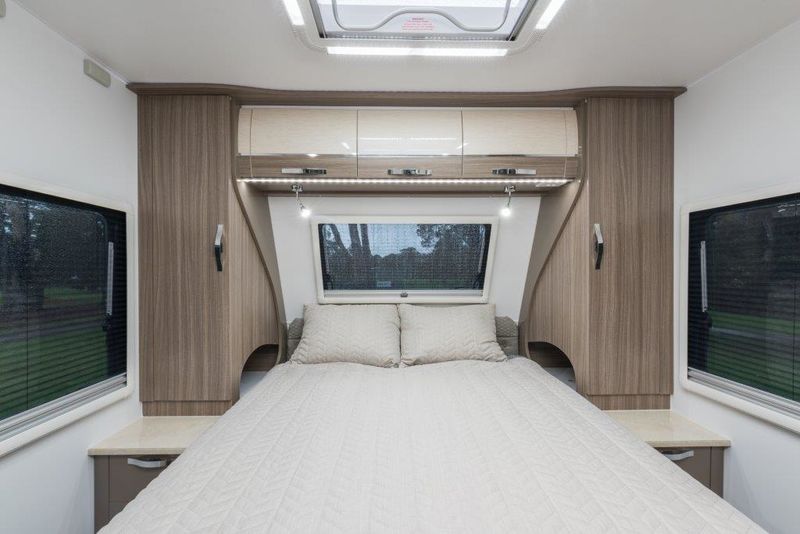 The 556 Tourer: offers a stylish modern layout that includes a large island double bed, cafe dinette seating, large galley style kitchen, full ensuite with separate shower and toilet, and a large front tunnel boot.