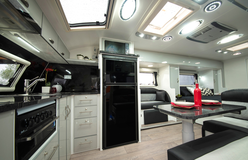 The Pride Platinum is at the forefront of luxury caravanning. Unwind and relax on your leather upholstered furniture with a book or enjoy the large TV in the comfort of your air-conditioned luxury slide out caravan.