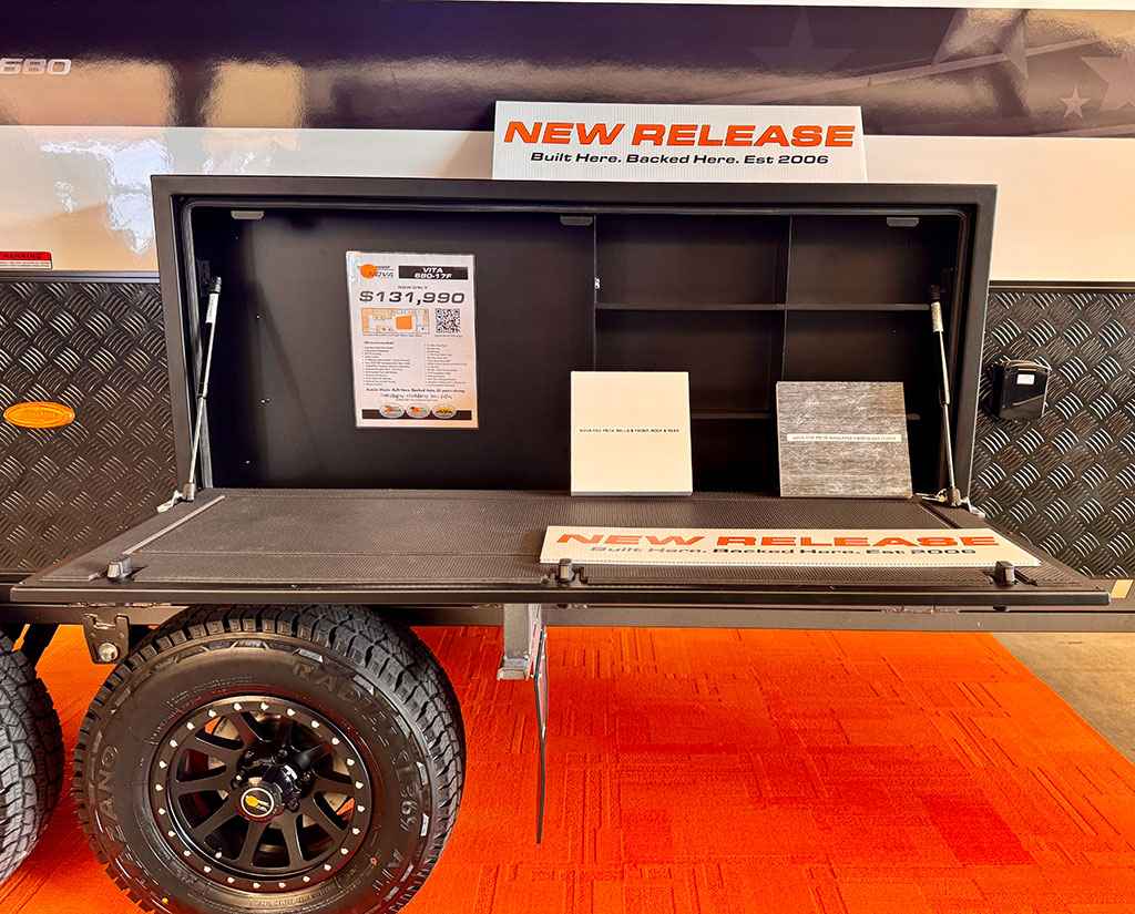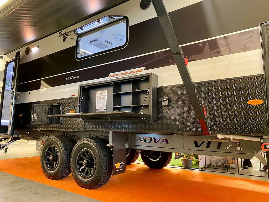 The Nova VITA Off-Road exterior is designed for strength, durability and premium Australian touring. Built using Nova’s exclusive ECO'TUFF timber-free fibreglass sandwich construction, it features a one-piece front, roof and rear, one-piece composite walls and an insulated one-piece floor, delivering a stronger, lighter structure with exceptional insulation. Finished with XTreme ACX aluminium coaming and bold 2026 Bravo decals, the VITA combines rugged off-road capability with a modern look. Practical features including a full galvanised tunnel boot, roll-out awning with LED lighting, picnic table with shelving, external speakers, gas bayonet, reverse camera and 600W of solar, ensure the VITA is built for comfortable, extended Australian adventures.